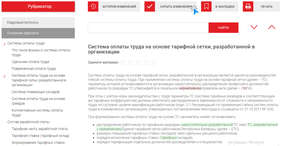 Если же вы хотите посмотреть, что конкретно было изменено в каждой версии материала относительно старой версии (в том числе в актуальной), нажмите на кнопку «Показать изменения». После этого по тексту материала зеленой заливкой будет выделено то, что было добавлено, а красной –удалено. Это поможет вам за считанные минуты вникнуть в изменения законодательства на конкретной аналитике.