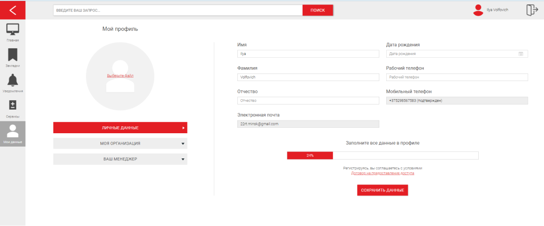 В данном разделе содержатся ваши персональные данные, а также данные вашей компании и контакты вашего личного менеджера.